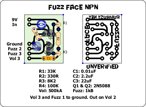 Fuzz Central - Has a few different Fuzz Face schematics, PNP and NPN.Short Scale - Veroboard layout for NPN Fuzz Face.
