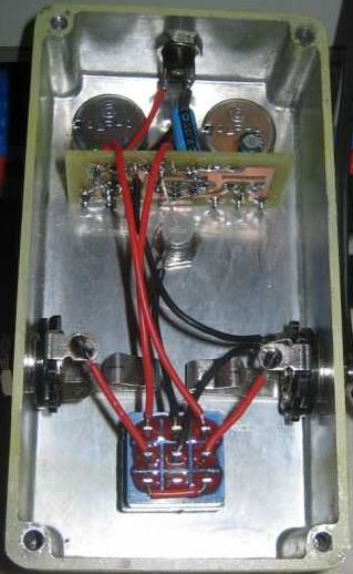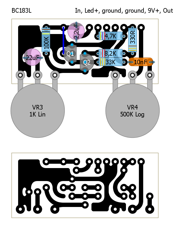This is a verified silicon (BC183L) Fuzz Face pcb layout with onboard led resistor. Note that the 22uF capacitor needs to be folded down, flat againts the board for the potentiometer to fit. See gut shot to see how to install this board in your stompbox.Alternative layout