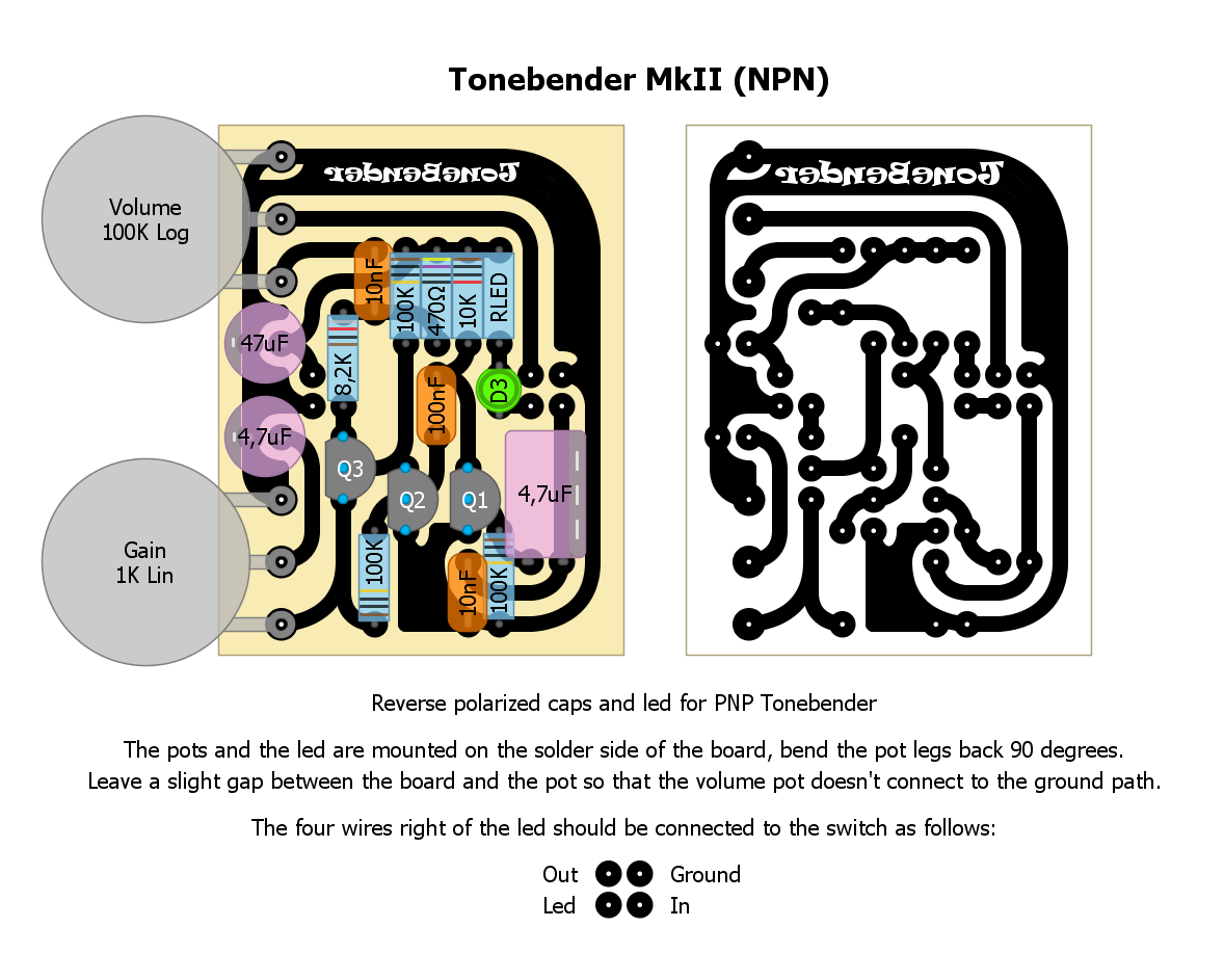 The Solasound Tone Bender Professional Mk II otherwise known as Vox Tone Bender Professional Mk II, Marshall Supa Fuzz, RotoSound Fuzz Box or Rangemaster Fuzz Bug. This is yet another classic fuzz. Similar to the Fuzz Face but with a third transistors tucked on at the end as an extra gain stage.Layout and Transfer